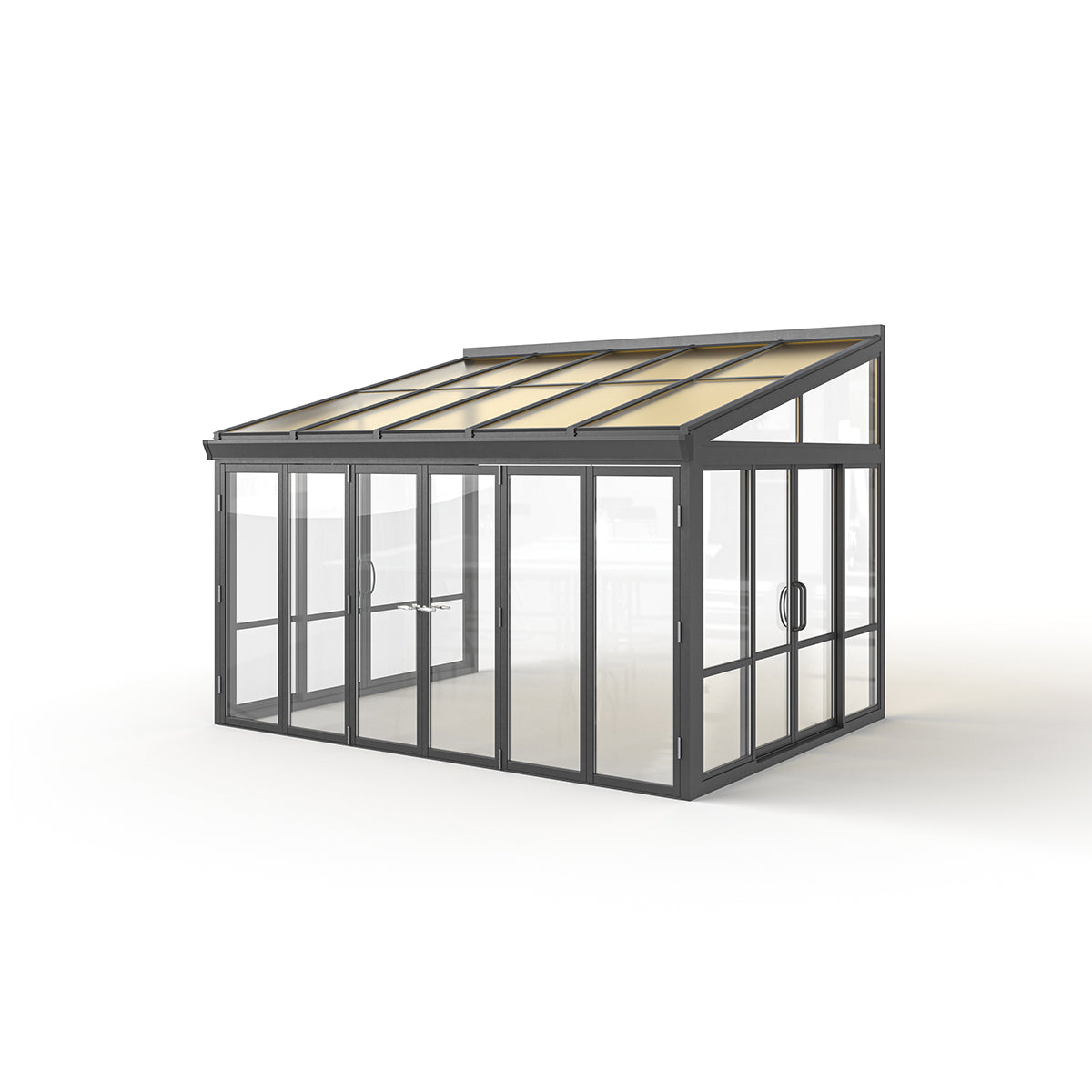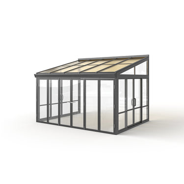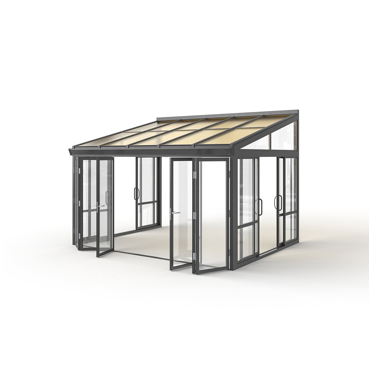 This premium glass sunroom is all about open-air living in a slightly smaller footprint. The fully retractable bi-fold doors create a seamless transition from indoors to outdoors, allowing you to enjoy natural sunlight, refreshing winds, and the beauty of your surroundings without barriers. The tempered glass panels provide clear, safe, and elegant views, while the clear polycarbonate roof panels allow maximum sunlight to enter while protecting you from the elements. The durable powder-coated metal frame ensures long-lasting performance and all-weather resistance. The modern black finish complements a wide range of architectural styles, making this compact sunroom the perfect addition for homeowners seeking style, practicality, and space efficiency.