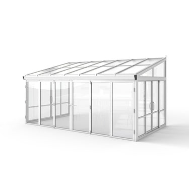Transform your outdoor living space with the REAL Tempered Glass Sunroom With Bi-Fold Doors Greenhouse Patio Home Addition - White (16.7' Wide), a sleek and durable home addition that blends indoor comfort with outdoor beauty. Featuring real tempered glass wall panels and bi-fold doors, clear polycarbonate roof panels, and a sturdy white powder-coated metal frame, this stunning sunroom is designed to maximize natural light, enhance your home's value, and create a year-round retreat. Whether you use it as a stylish greenhouse, a serene reading nook, an elegant dining space, or a luxurious pool house, this sunroom offers unmatched versatility and elegance for your patio or backyard.