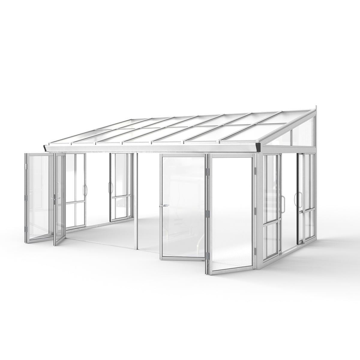 This premium glass sunroom is all about open-air living. The fully retractable bi-fold doors create a seamless transition from indoors to outdoors, allowing you to enjoy natural sunlight, refreshing winds, and the beauty of your surroundings without barriers. The tempered glass panels provide clear, safe, and elegant views, while the clear polycarbonate roof panels allow maximum sunlight to enter while protecting you from the elements. The durable powder-coated metal frame ensures long-lasting performance and all-weather resistance. The modern white finish complements a wide range of architectural styles, making this sunroom the perfect addition for homeowners seeking style and practicality.