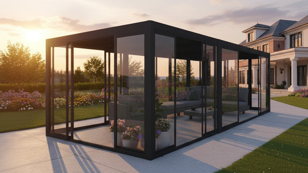 The clarity of glass, the control of a louvered pergola, and the feel of a modern cabana—all in one roofed pergola system. With sliding tempered-glass walls and an adjustable aluminum louvered roof, this versatile outdoor structure functions as a pergola, cabana, or gazebo, offering protection from sun, wind, and rain while maintaining open-air comfort. Perfect for barbecues, outdoor entertaining, or year-round relaxation, it brings seamless views, all-weather shelter, and flexible design to any backyard or patio.