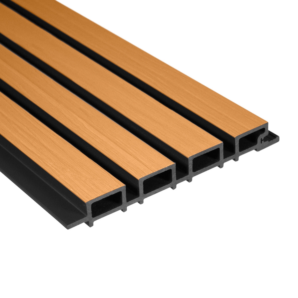 Product Specifications – Wide 4-Strip Copper Teak with Black Gap Composite Siding Panels – 1.5" Slats for Exterior Wall Cladding