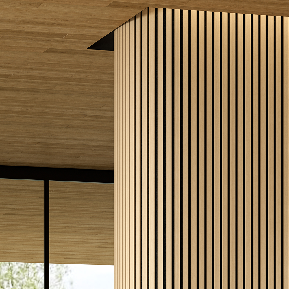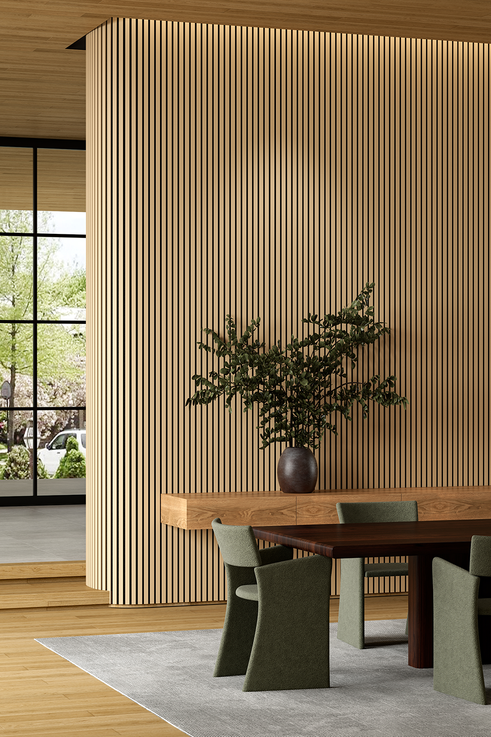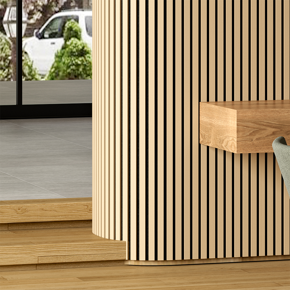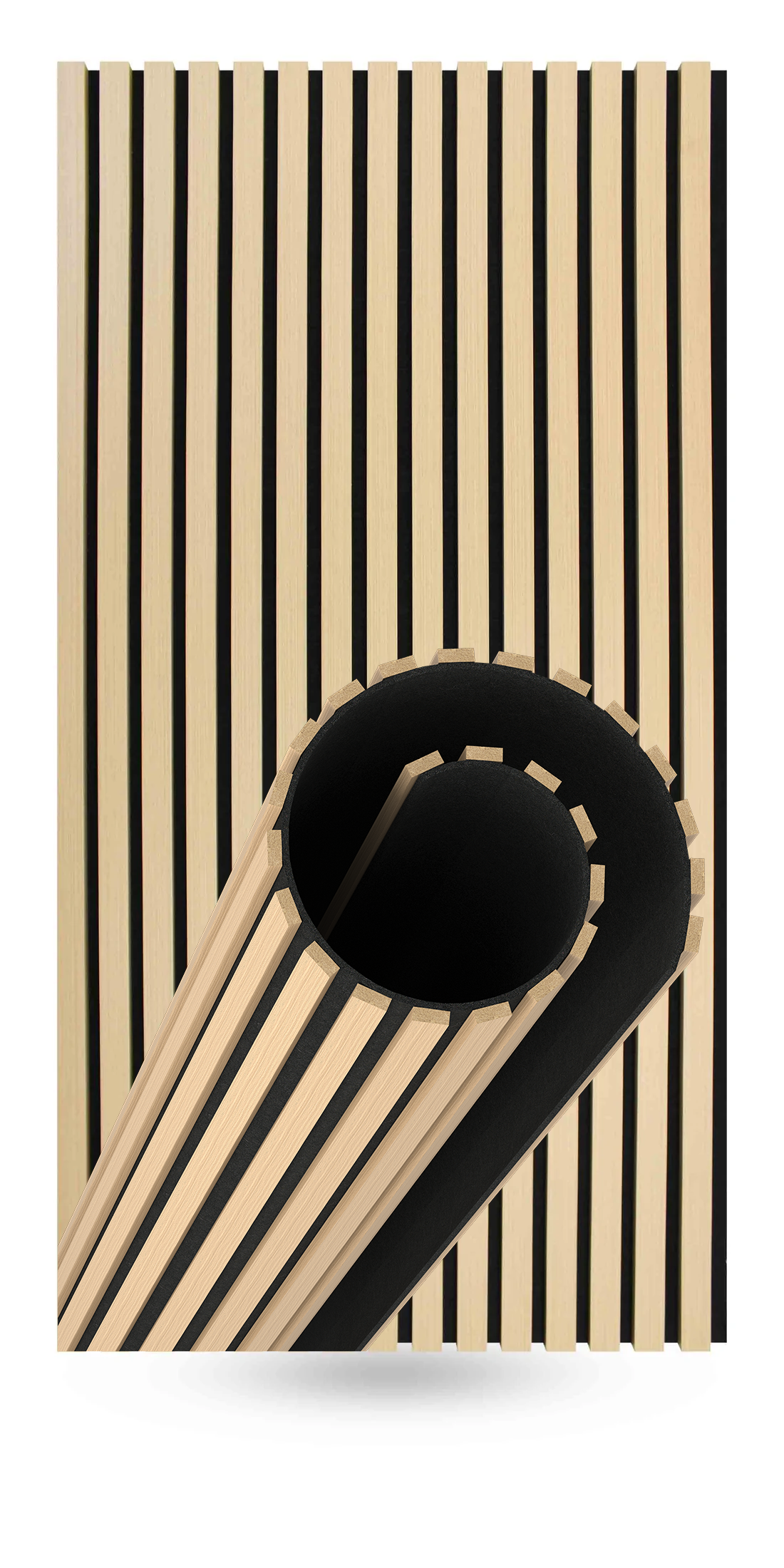 Crafted with real wood veneer Panels on a flexible acoustic felt backing, these panels are designed to reduce echo and enhance ambiance. The flexible core allows for seamless application on curved walls, ceilings, columns, or unique architectural surfaces—perfect for residential or commercial projects.